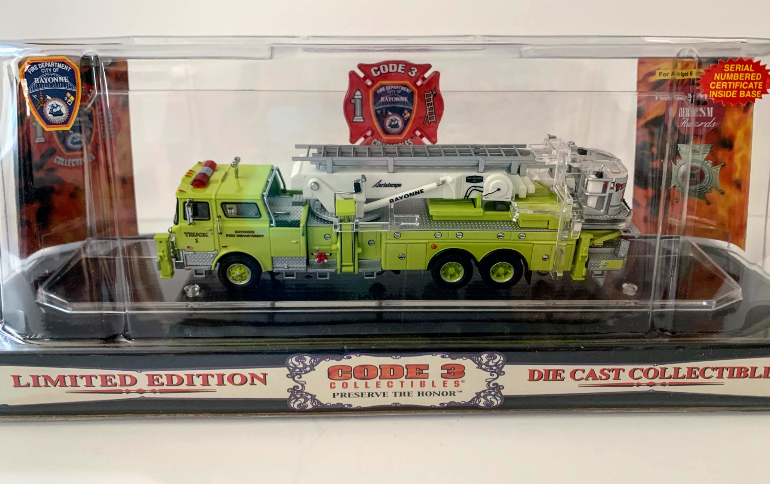 Code 3 – Bayonne, NJ Mack CF Aerialscope Tower Ladder 1, #12510. Original diecast release date of June 2003. Bayonne is a peninsula city with New York Harbor to the east, Newark Bay to the west, and Jersey city to the north. It is also connected to Staten Island via the Bayonne Bridge, making this a great piece for both New York and New Jersey diecast collectors. Features bright yellow/green color scheme. Details include bucket that raises and lowers as well as many other fine details. All Code 3 stock are discontinued items and come in the original packaging. 1:64 scale.
