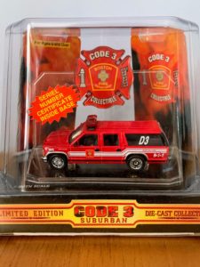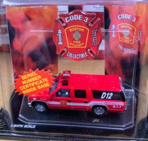 Code 3 – Boston GMC Suburban D-12, #12402. Original diecast release date of February 1998. This model was also released in numbers D-7, D-9, D-3 and H-1. Makes a great addition to any Boston or New England  diecast collection. All Code 3 stock are discontinued items and come in the original packaging. 1:64 scale.