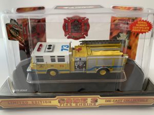 Code 3 – Chesterfield County FD Pierce Pumper 73. #12772. Original release date of March 2000. This bright yellow fire apparatus features white cab and blue pin stripe. Makes a good starter piece for those new to Code 3 diecast collecting. All Code 3 stock are discontinued items . Comes with original packaging. Quantities are very limited. 1:64 scale.