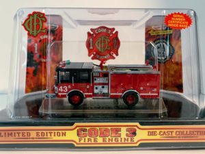 Code 3 – Chicago Luverne Pumper 43, #12316. Part of a series of four with an original diecast release date of March 1999. Other engine numbers in the series are 70, 109, and 121. Painted in the traditional CFD black and red, this diecast replica is a great addition to any CFD collection. All Code 3 stock are discontinued items and come with original packaging. 1:64 scale.
