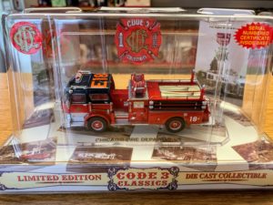 Code # – Chicago Mack Pumper 18, #12348. Original diecast release date of 2003. This Mack Pumper replica features Chicago Fire Departments signature colors of red and black with chrome color details. All Code 3 stock are discontinued items and come in the original packaging. 1:64 scale.