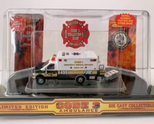 Code 3 – Chief’s Edition #4 Ford E-350 Ambulance 499, #12253-M. Original diecast release date of May 1999. Part of the limited edition collectors series by Code 3. Diecast features black, white and gold ambulance with a Code 3 emblem on the door. This vehicle has all the fine details you expect from Code 3 . Back doors open to reveal removable transport gurney. All Code 3 stock are discontinued items and come in the original packaging. 1:64 scale.