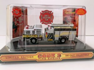 Code 3 – Chief’s Edition #9 Pierce Dash TM Pumper 9, #12259. Original diecast release date of October 2000. Part of the limited edition Chief Collectors series. Diecast is in the signature Chief’s Collection colors of black, white and gold. Many fine details including code 3 emblem on the door. all Code 3 stock are discontinued items and come with the original packaging. 1:64 scale.