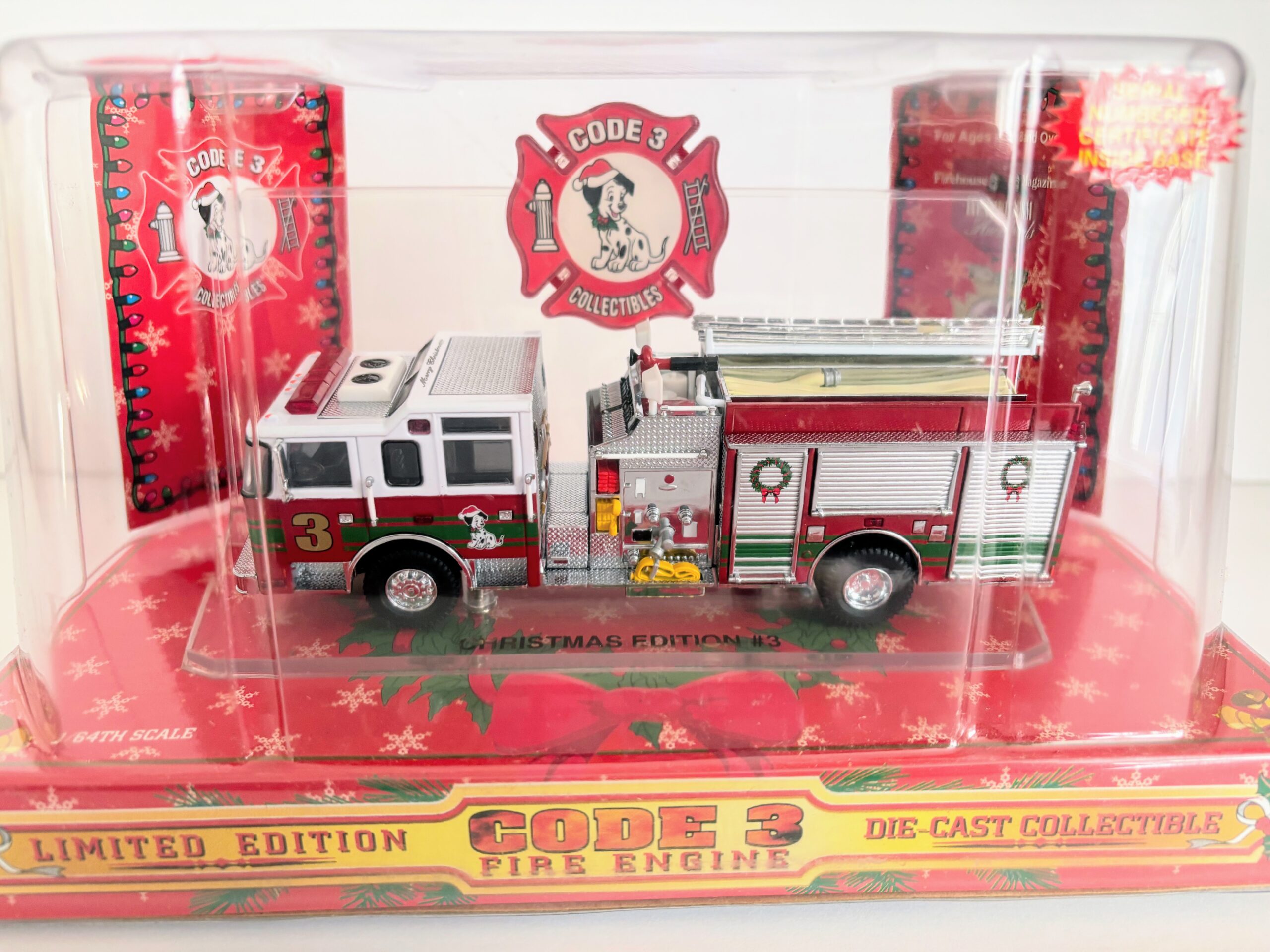 Code 3 – Christmas Edition 2000 Pierce Dash Top Mount, #12271. Original diecast release date of October 2000. Vehicle # 3 of the Code 3 Christmas series. Features a festive white red color scheme with chrome colored trim and holiday wreaths and Dalmatian logo on the cab. Makes for a fun part of your holiday decor and a unique addition to any firefighting diecast collection. All Code 3 stock are discontinued items and come in the original packaging. 1:64 scale.