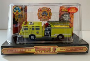 Code 3 – Dearborn Heights Pierce Quantum Engine 31, #12768. This diecast has an original release date of January 1999. Nicely detailed with removable ladders and diamond plate finishes. Painted in a bright emergency yellow color. This Pierce Quantum is a fine addition to your Michigan diecast collection. All Code 3 stock are discontinued items and come with the original packaging. 1:64 scale.
