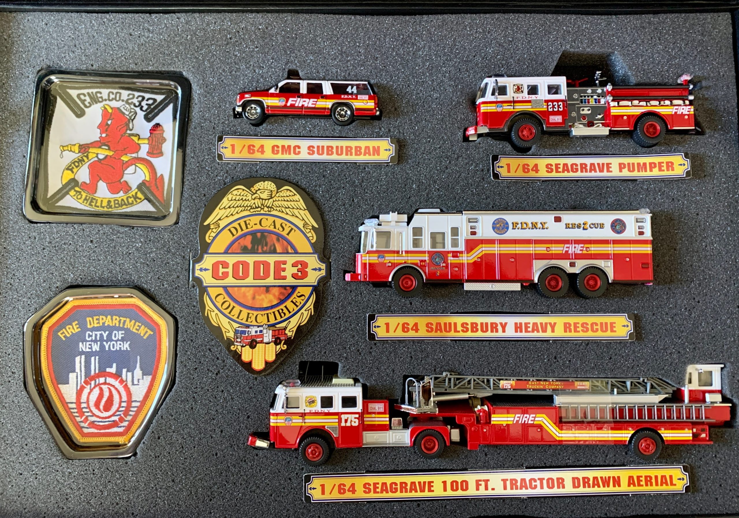 Code 3 – FDNY Battalion Set 44, 12821. Original diecast release date of March 1999. This boxed set features 4 different types of apparatus from Battalion 44, which is located in Brooklyn, New York. Set comes in a beautiful, black vinyl display box and includes Engine 233, Rescue 2, Ladder 175 and Battalion 44. Also comes with collectable patch from Engine Company 233 and FDNY. All replicas are exclusive to this set. A must have for any FDNY collector! This set is in BRAND NEW condition, never out of the box or displayed. Comes with the original packaging. This set requires and additional oversized shipping fee of $15.00. 1:64 scale.