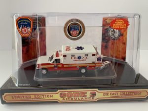 Code 3 – FDNY Ford F-350 Ambulance, #12101. This highly collectable diecast has an original release date of April 1999. Ambulance features red and white body with FDNY logos. All Code 3 stock are discontinued items and come in the original packaging. 1:64 scale.