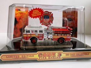 Code 3 – FDNY Seagrave Pumper 277, #12300. Part of Series #2 with an original diecast release date of April 1998. Other engine numbers in this series are 9,42,45,48,and 279. Engine 277 serves the Brunswick section of Brooklyn. Makes a great addition to any FDNY diecast collection. All Code 3 stock are discontinued items and come with the original packaging. 1:64 scale.