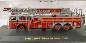 Code 3 – FDNY “Yankees” Ladder 49 Seagrave Rear Mount, #12851. The FDNY station known as the House on the Hill, responds to calls at Yankee Stadium. The actual fire apparatus that inspired this diecast is painted with the New York Yankee’s Major League Baseball logo. This model also features “bronx Bombers” on the windshield and 9/11 memorial on the front cab. Original release date April 2004. The Fire Bell is an original, authorized Code 3 dealer and all Code 3 stock are discontinued items and come with the original packaging. 1:64 scale.