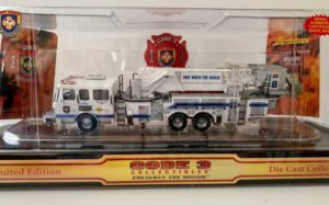 Code 3 – Fort Worth, Texas ALF Mid Mount Tower Ladder 8, #12746. Original diecast release date of August 2003. Features all white ladder truck with blue trim and chrome colored details. Many fine details including a ladder that raises and lowers. A must have American La France for any Code 3 or Texas diecast collection. All Code 3 stock are discontinued items and come in original packaging. 1:64 scale.