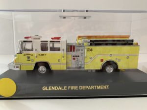 Code 3 – Glendale Fire Deptment Pierce Quantum Engine 24 # 12756. Part of the California Fire Departments, this bright yellow diecast fire apparatus was first released by Code 3 in May of 2006. This unusual colored fire apparatus diecast is a great addition to any collection. All Code 3 stock are discontinued items and come in the original packaging. 1:64 scale.