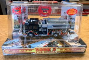 Code 3 – L.A> Toy Run Sutphen Pumper E -7, #12294. Original release date December 2002. This Harley design was created to commemorate the 7th annual Toy Run For Kids. this annual event was performed by Harley riders to benefit the Children’s Hospital in Los Angeles. Pumper features a black body with Harley Davidson styled orange flames. This collectable diecast is a must have for your collection! All Code 3 stock are discontinued items and come in the original packaging. 1:64 scale.