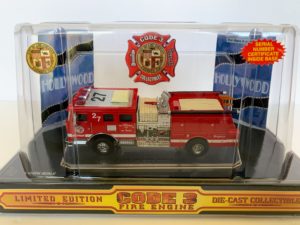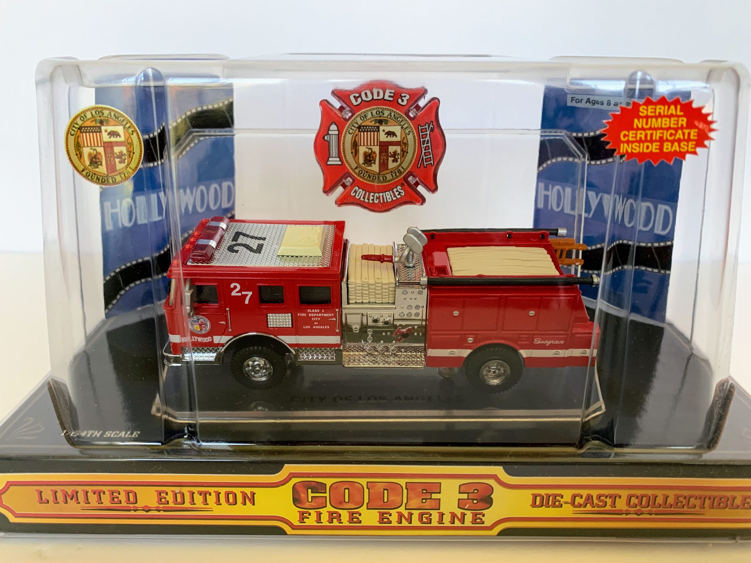 Code 3 – Los Angeles Hollywood Seagrave Pumper 27 (Red), #12303. Original diecast release date of October 1998. This diecast replica was also issued in engine numbers 41, 52, and 82 in the color red. Code 3 also released a version of the L.A. Hollywood truck in midnight blue. This piece has all the fine details you have come to expect from Code 3 products. All Code 3 stock are discontinued and come with the original packaging. 1:64 scale.