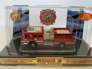 Code 3 – Los Angeles Hollywood Seagrave Pumper 52 (Red), #12303. Original diecast release date of October 1998. This diecast replica was also issued in engine numbers 27, 41, and 82 in the color red. Code 3 also released a version of the L.A. Hollywood truck in midnight blue. This piece has all the fine details you have come to expect from Code 3 products. Makes a great addition to your California diecast collection. This particular Code 3 item is in excellent condition, however, the plastic box packaging has slight discoloration due to age. Price reflects condition of packaging. 1:64 scale.