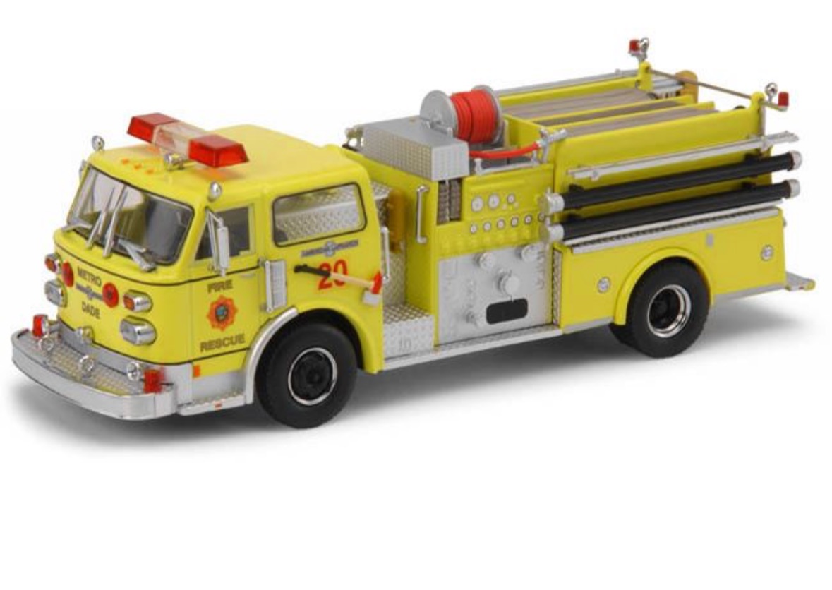 Code 3 – Metro Dade American La France Engine 20, #12865. Original diecast release date of December 2006. This ALF replica has many nice details including a hose reel and detailed panel. Features Miami-Dade traditional bright yellow color with realistic department logos. A must have for any Florida diecast collection. 1:64 scale.