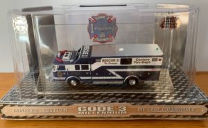 Code 3 – Millennium Series Pierce Heavy Rescue 21, #12215. Original diecast release date of January 2000. The Millennium Series commemorates the 21 century, with each vehicle having a limited release of 2000. This diecast features DuPont Chrome Illusion paint. Paint color changes from shades of blue to purple with the movement of light. A must have for any Code 3 collector. All Code 3 stock are discontinued items and come with the original packaging. 1:64 scale.
