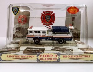 Code 3 – New York Department of Corrections Mack CF Pumper 1, #12357. Original diecast release date November 2001. This unique diecast is painted in dark blue and white, instead of the traditional red and white. A stand out piece for any New York fire or law enforcement diecast collection. All CODE 3 stock are discontinued items and come with the original packaging. 1:64 scale.