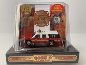 Code 3 – Philadelphia, PA GMC Suburban Battalion B13, #12419 This Battalion 13 diecast replica has an original release date of June 1999. Suburban features red body, white top and yellow stripe. All Code 3 stock ar discontinued items and come in the original packaging. 1:64 scale.