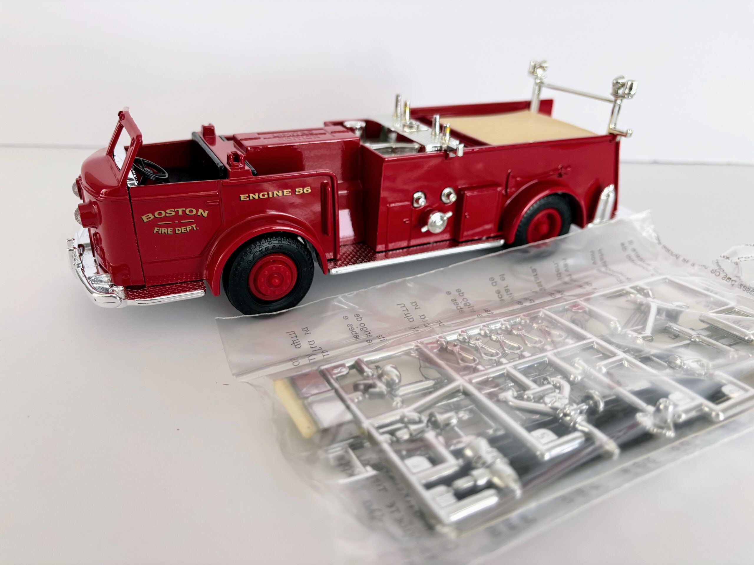 Coin Bank – Boston 1948 American La France Fire Engine, #ERT-B179. Manufactured in the U.S.A. by the Ertl Company, Inc. Metal diecast construction with some plastic parts. Comes partially assembled. Minor detail pieces are included making it a fun and easy project to complete yourself. Features classic bright red color with realistic Boston Fire lettering in gold and detailed interior. This diecast is a fully locking coin bank with key, but also makes an impressive addition to any fire apparatus diecast collection. Makes a great gift for any Massachusetts or New England collector. Comes with all of the original packaging, as well as all additional parts, unused and in their original packaging. 1:30 scale.