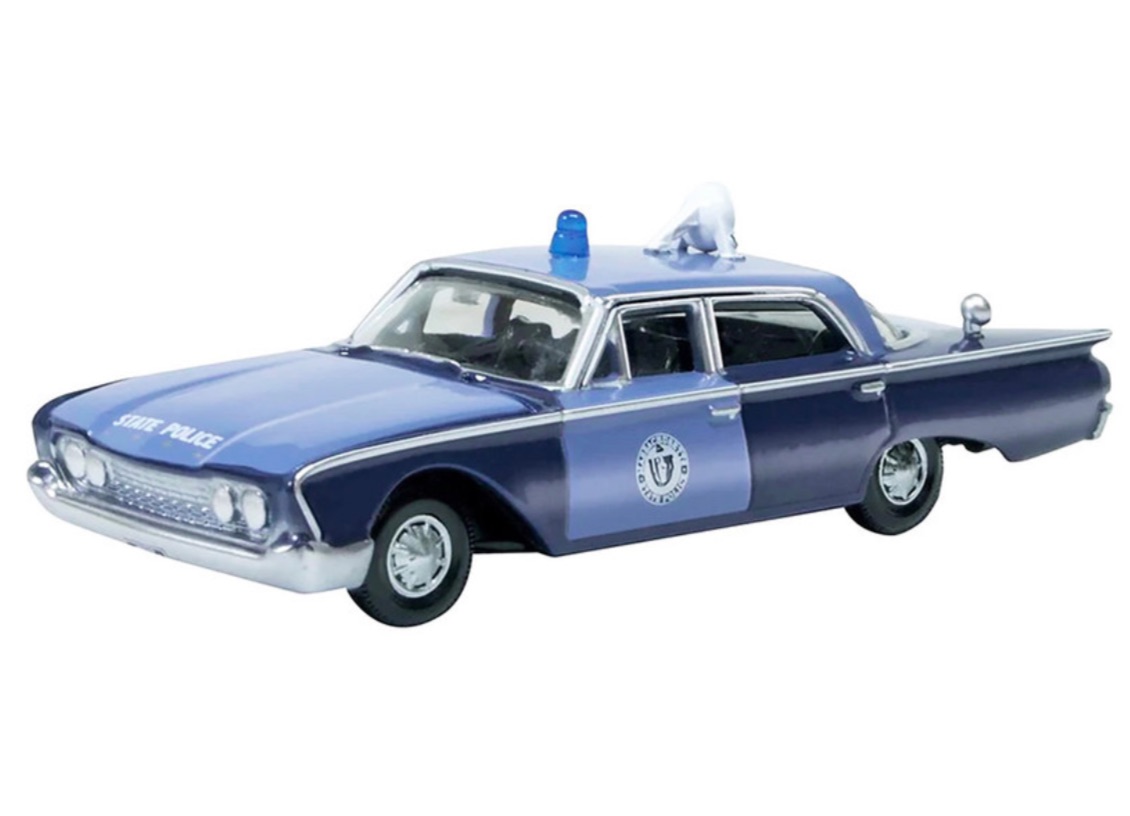 Ford Fairlane 1960 Sedan Massachusetts State Police Radar Car, #OX-87FF60002. Released by Oxford Diecast. Nicely detailed replica features Massachusetts tradition two tone blue colors. Details includes realistic bubble light and search light. Makes a great addition to any HO sale display or Massachusetts diecast collection. 1:87 scale.