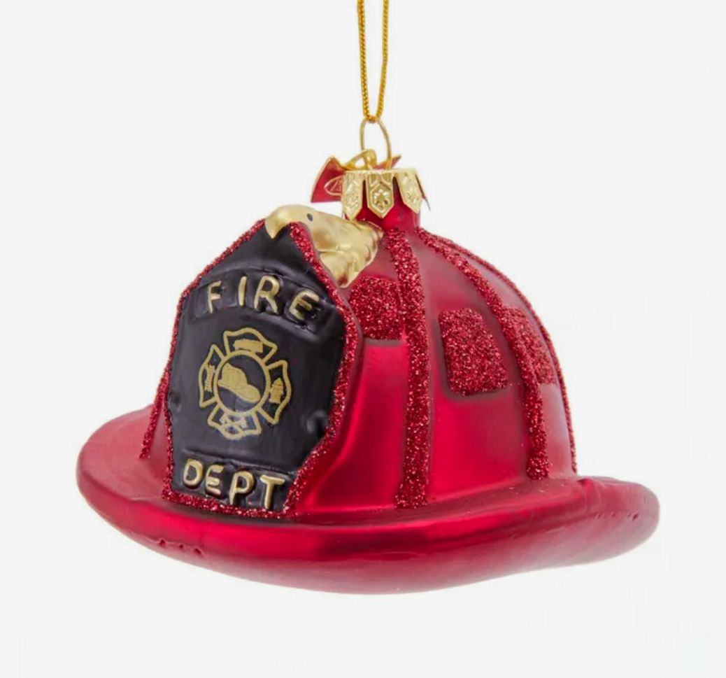 Ornament – Fire -Glass Firefighter Helmet, #NB1614. Part of the Kurt Adler Noble Gem Collection. This beautifully crafted glass ornament features a black Fire Dept. helmet front on a red helmet. Accented in red glitter and gold lettering. Makes a great addition to your Christmas tree display, or give as a keepsake gift to your favorite firefighter. Approximate size 3.5″.